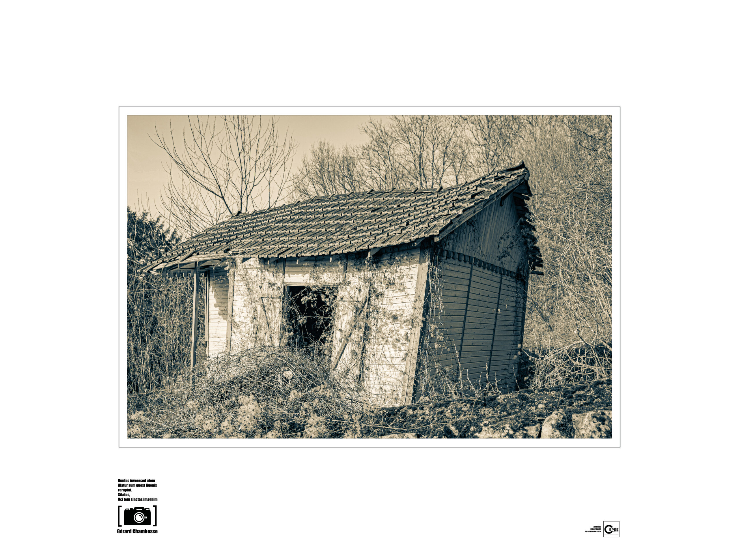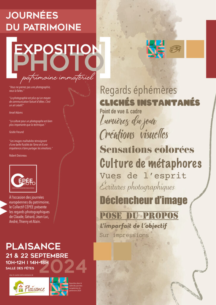 Le projet d’exposition. Dans le cadre des Journées européennes du Patrimoine des 21 et 22 septembre 2024, le collectif CÉPÉE propose une exposition sur le patrimoine immatériel constituée de collections de photographies illustrant le regard des auteurs, membres de l’association. L’exposition est présentée dans la salle des fêtes de Plaisance.